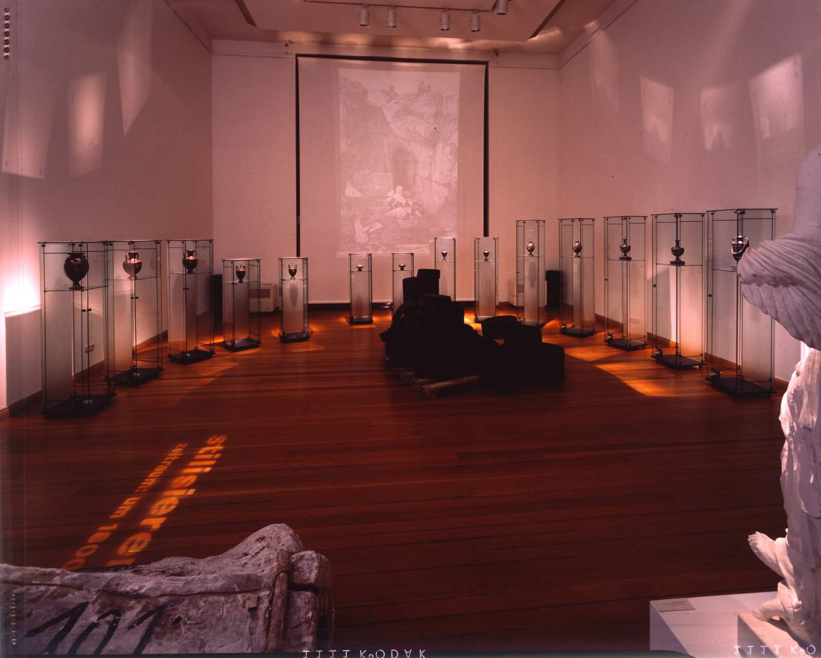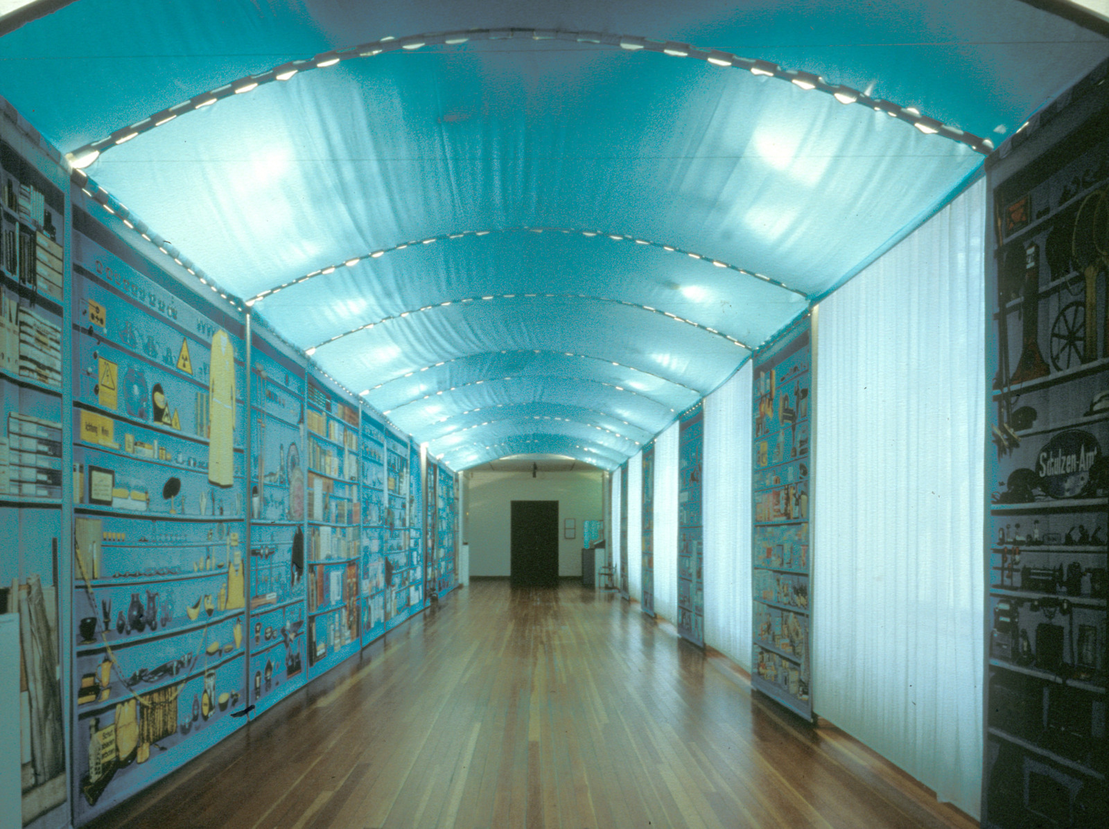 Diese historische Dimension bildete den Hintergrund für das Raumbild “bemustern”, eine vollständig objektfreie, multimediale Installation. In einem ca. 300 qm großen, weißen, d.h. vollkommen abstrakten Raum hing dezentral ein weißer mit Projektionsfolie überzogener Würfel (Seitenmaß: 220×220 cm) von der Decke, ca. 60 cm über dem Boden schwebend. Als zweites Element hingen ebenfalls von der Decke bis auf den Boden ca. 40cm breite, weiße Transparentpapierstreifen, auf denen untereinander, in schwarzer Schrift, Begriffe standen; es handelte sich um die Kopie des alphabetischen Registers aus dem Buch „Systematik kulturhistorischer Sachgüter“ von Walter Trachsler (Bern 1981), eines Standardwerks zur musealen Einordnung von Objekten.