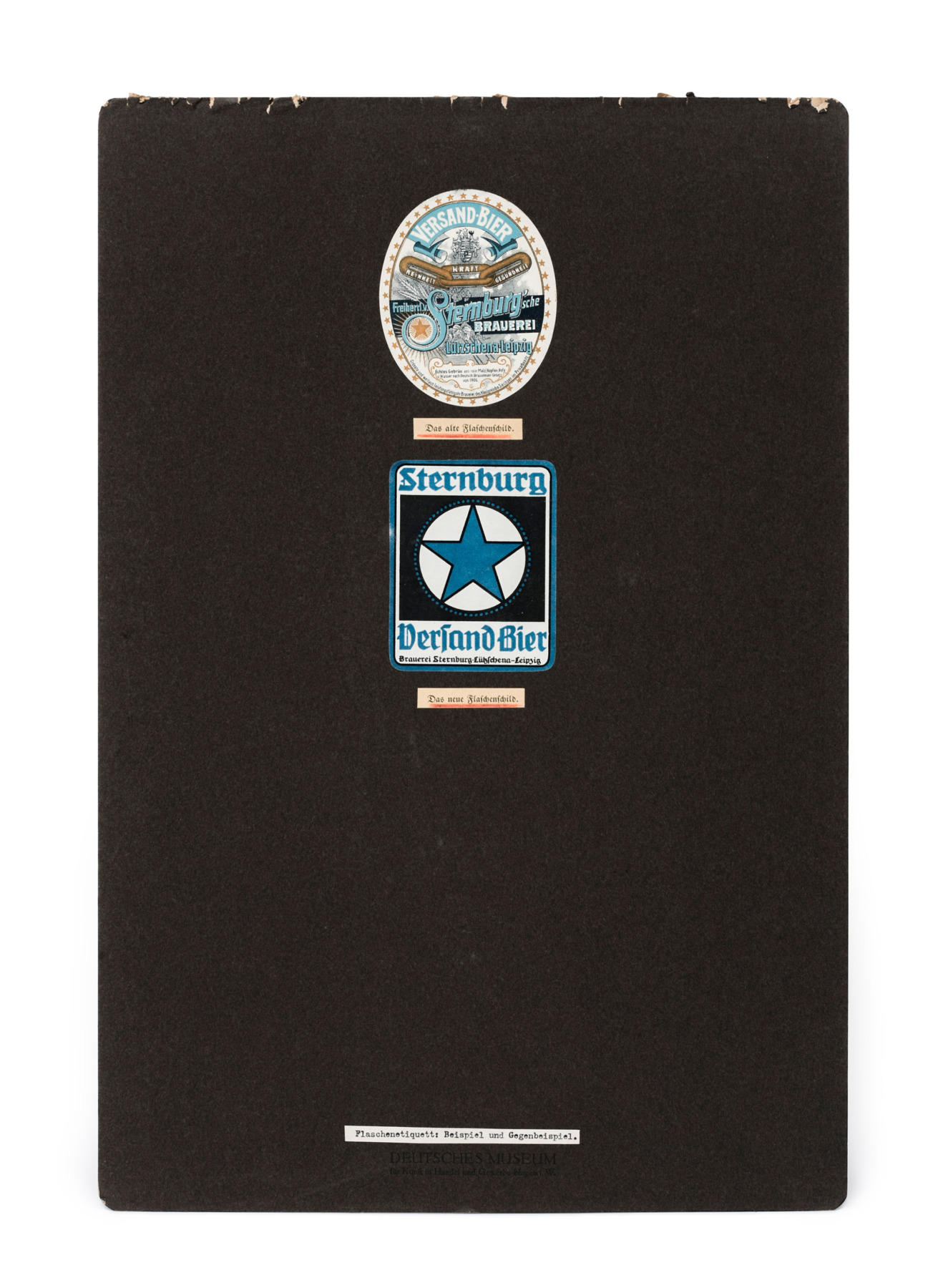 Diese zwei Flaschenetiketten sind in der aktuellen Sonderausstellung „Reklamekunst statt Kunstgewerbe?“ zu sehen, in der auf über 100 Präsentationskartons aus den 1910er Jahren zeitgenössische Reklame und Drucksachen gezeigt werden. Die Ausstellungen sollten der Vermittlung moderner Gestaltungsmöglichkeiten und der Förderung der „Geschmacksbildung in allen Volksschichten“ dienen. Insbesondere die Reklamedrucksachen lassen eine stringente Entwicklung vom Jugendstil hin zu sachlich-modernistischen Konzepten erkennen.