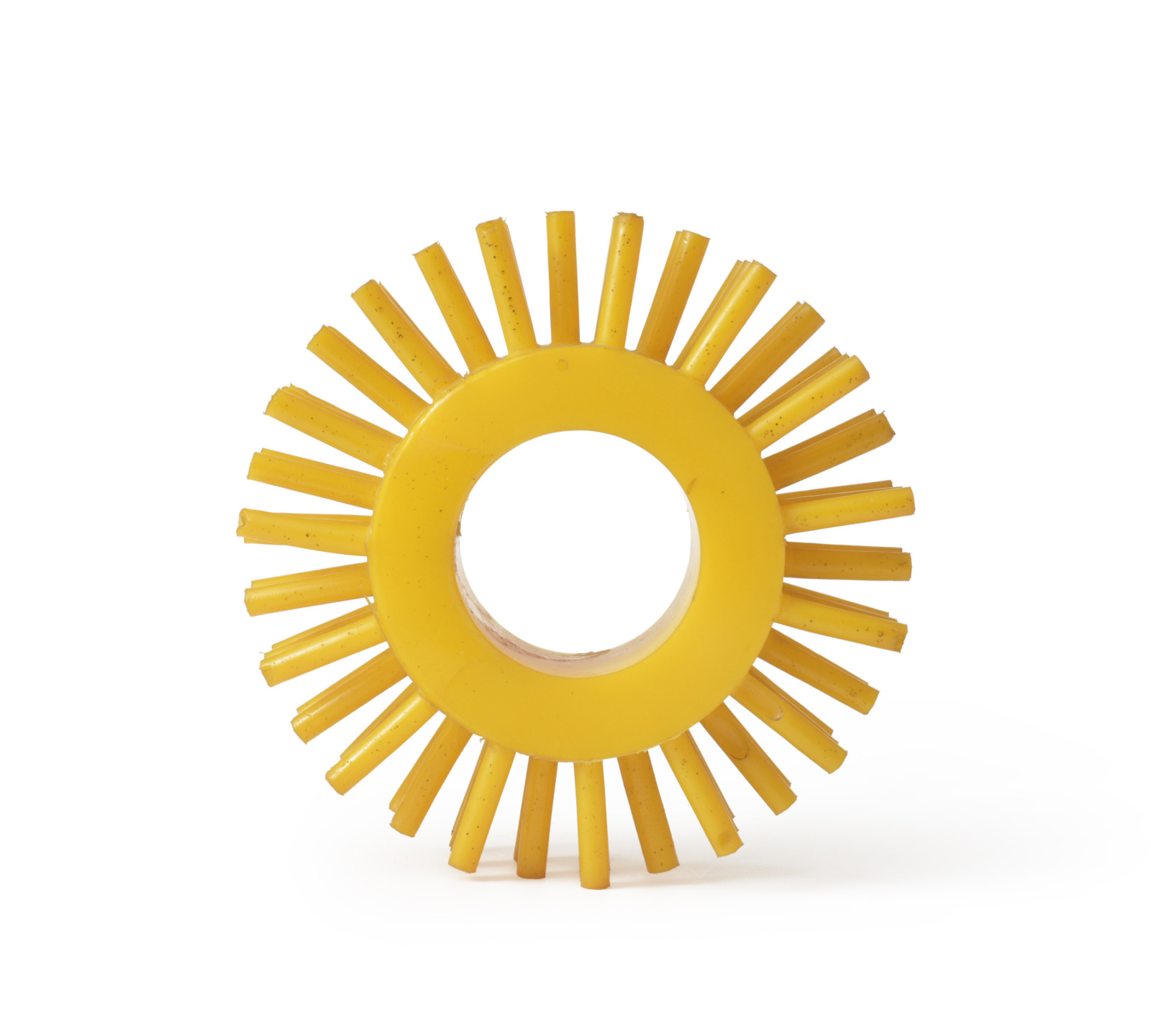 Daher fragen wir Sie: Wie wurde er vielleicht benutzt? Woran erinnert Sie das Objekt? Was ist daran interessant oder sonderbar? Warum ist es gelb? Haben Sie ein ähnliches Ding woanders schon einmal in Aktion gesehen? Kennen Sie den Zweck dieses merkwürdigen Rings oder haben Sie, so wie wir, zu diesem genoppten Ring mehr Fragen als Antworten?