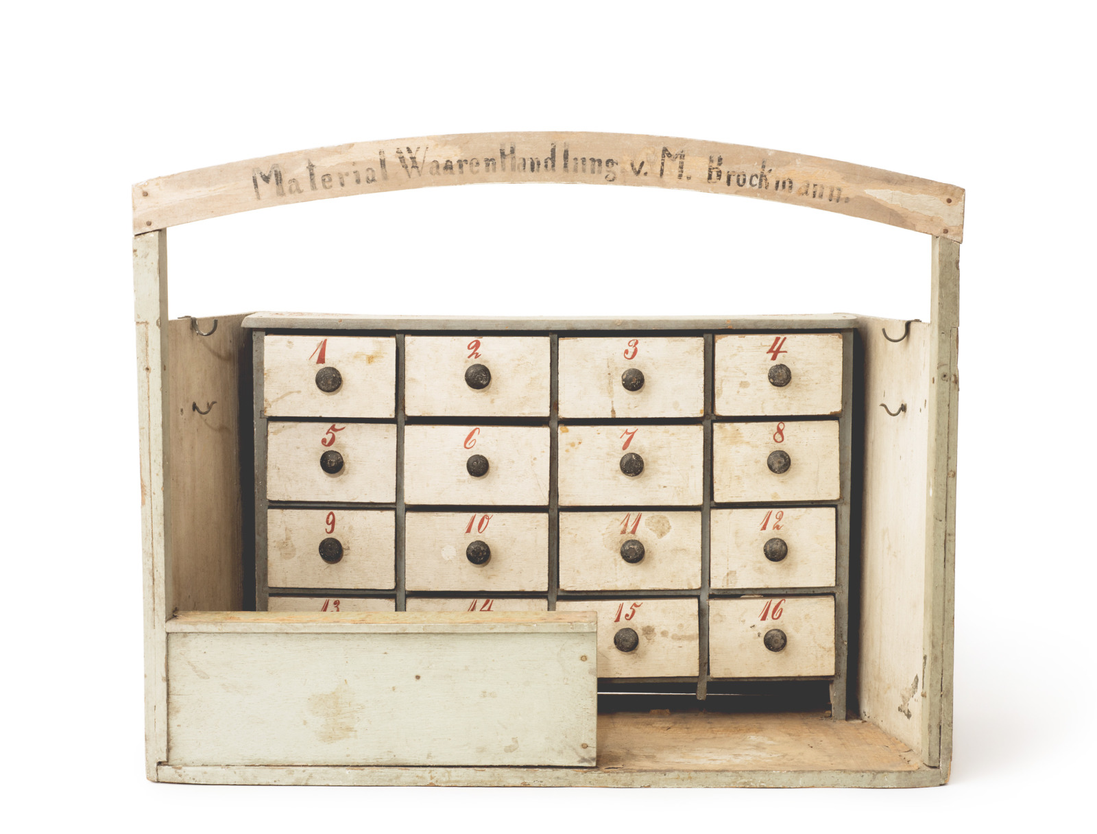 Als Teil von Lektion 6 „Sand, Seife, Soda“ der Sonderausstellung „Object Lessons. Material begreifen in 8 Lektionen“ war auch ein historischer Kaufladen für Kinder zu sehen. Auf dem hölzernen Bogen oberhalb des Miniaturtresens und der 16 Schubfächer ist der Schriftzug „Material Waarenhandlung von M. Brockmann“ angebracht. Ein Verweis auf die reale Entsprechung dieser Läden im 18. Jahrhundert. Materialwarenhändler, sogenannte „Materialisten“, verkauften Tee, Kaffee, Zucker, Färbe-, Reinigungs- und Heilmittel und Manufakturware (z.B. zugeschnittene Stoffe). Sie verfügten über entsprechendes Materialwissen zu Nutzung- und Anwendung dieser Waren und konnten so die Kundschaft fachkundig beraten.