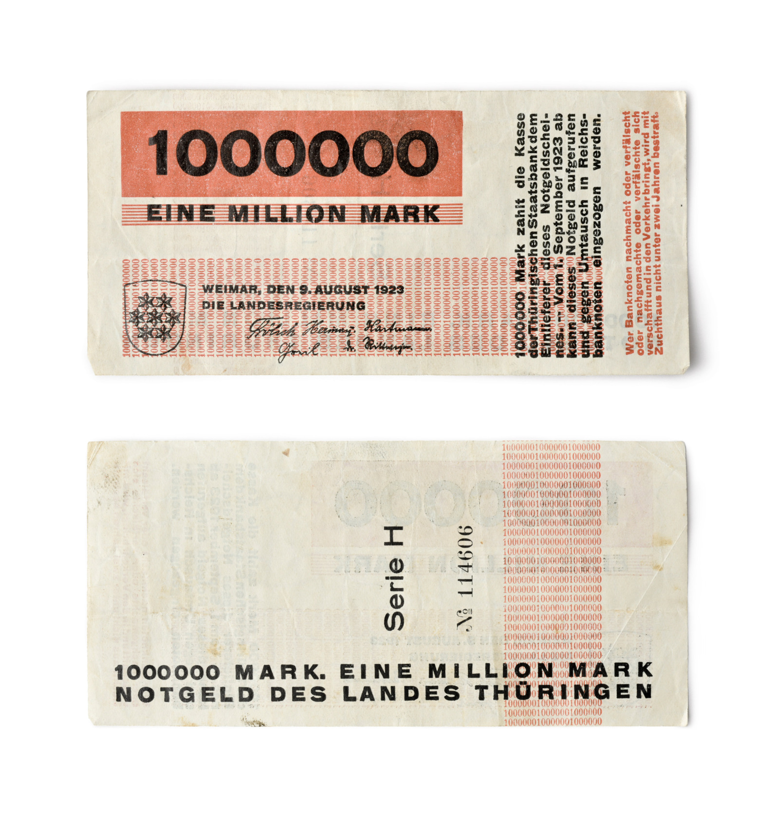 Die Inflation als eine der radikalsten Geldentwertungen in der Geschichte Deutschlands hatte zu diesem Zeitpunkt ihren Höhepunkt erreicht. Der Maler, Typograph und damalige Bauhaus-Jungmeister stellte innerhalb kürzester Zeit ein Konzept für das überregionale Notgeld des Landes Thüringen fertig.