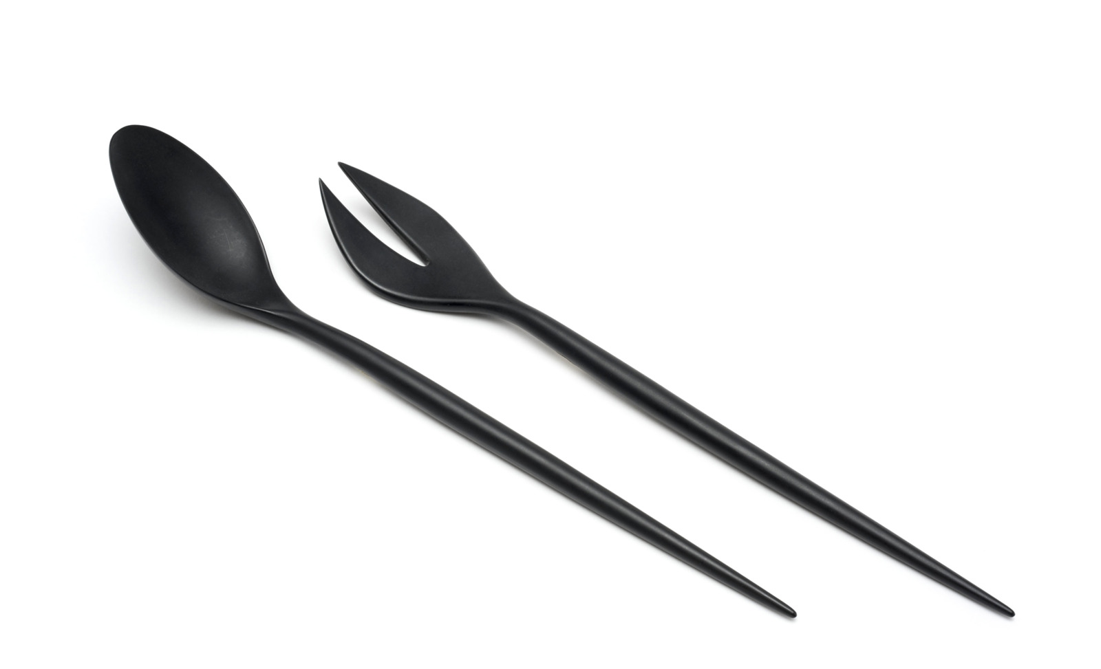 Das hier gezeigte zweiteilige Salatbesteck aus mattschwarzem opaken Melamin vom dänischen Designer und Herbert Krenchel (1922-2014) wurde 1953 entworfen. Es ist ein „Beleg dafür, dass Gerät aus Kunststoff, ist es nur so feinfühlig geformt und so einleuchtend gefärbt (…),  durchaus auch an der „Tafel“, dem vornehm-festlich gedeckten Tisch, seinen Platz finden kann.“