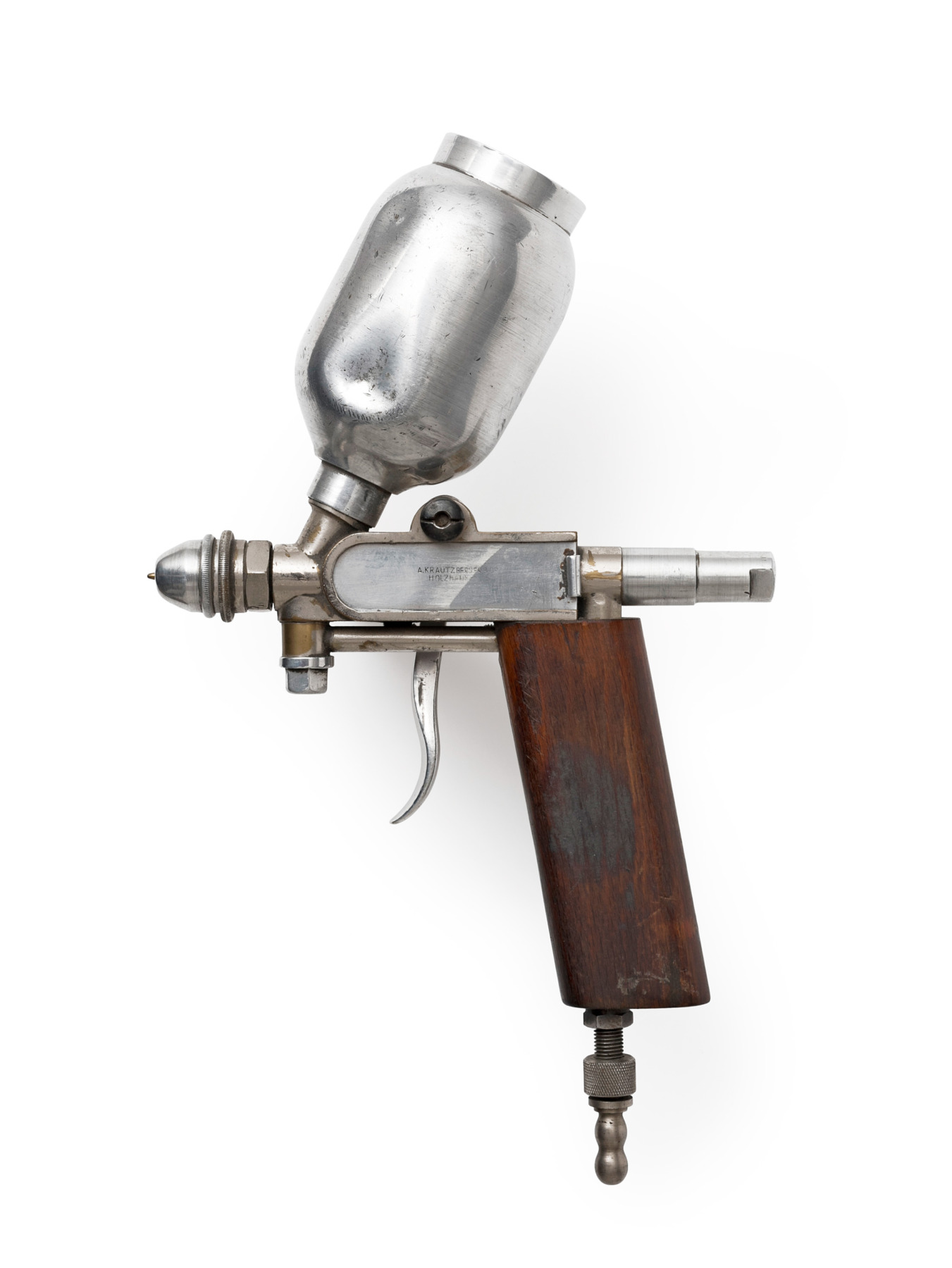 Die Spritzdekor-Pistole ist seit dem 10. Oktober 2019 im Rahmen der Sonderausstellung „Dekor als Übergriff?“ zu sehen, die sich dem populären Spritzdekor der 1920er und 1930er Jahre und den damit verbundenen, sozioökonomischen und technisch-künstlerischen Diskursen widmet.