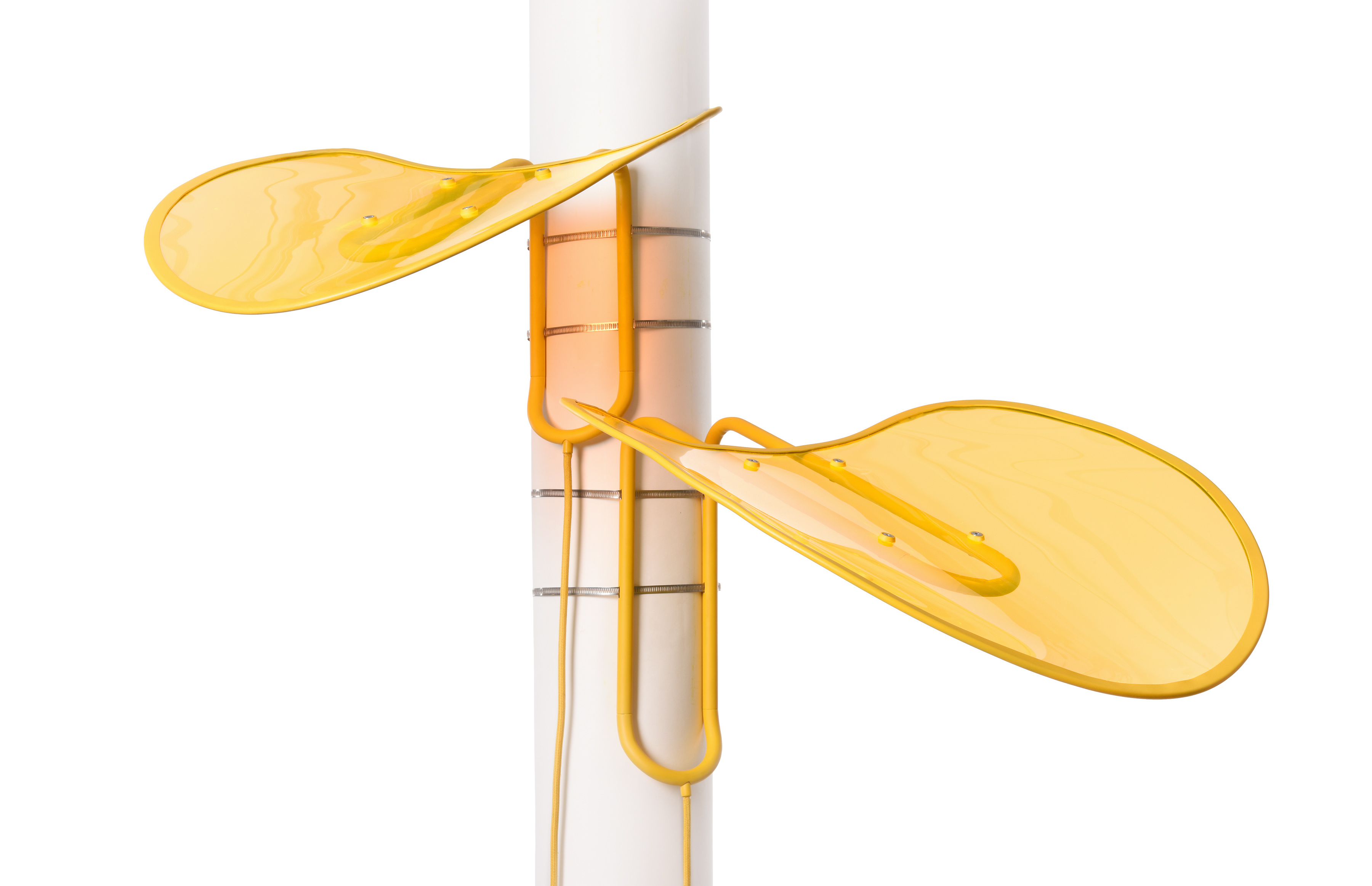 Solarladegerät für den öffentlichen Raum in Form einer Pflanze mit gelben Kunststoffblättern.